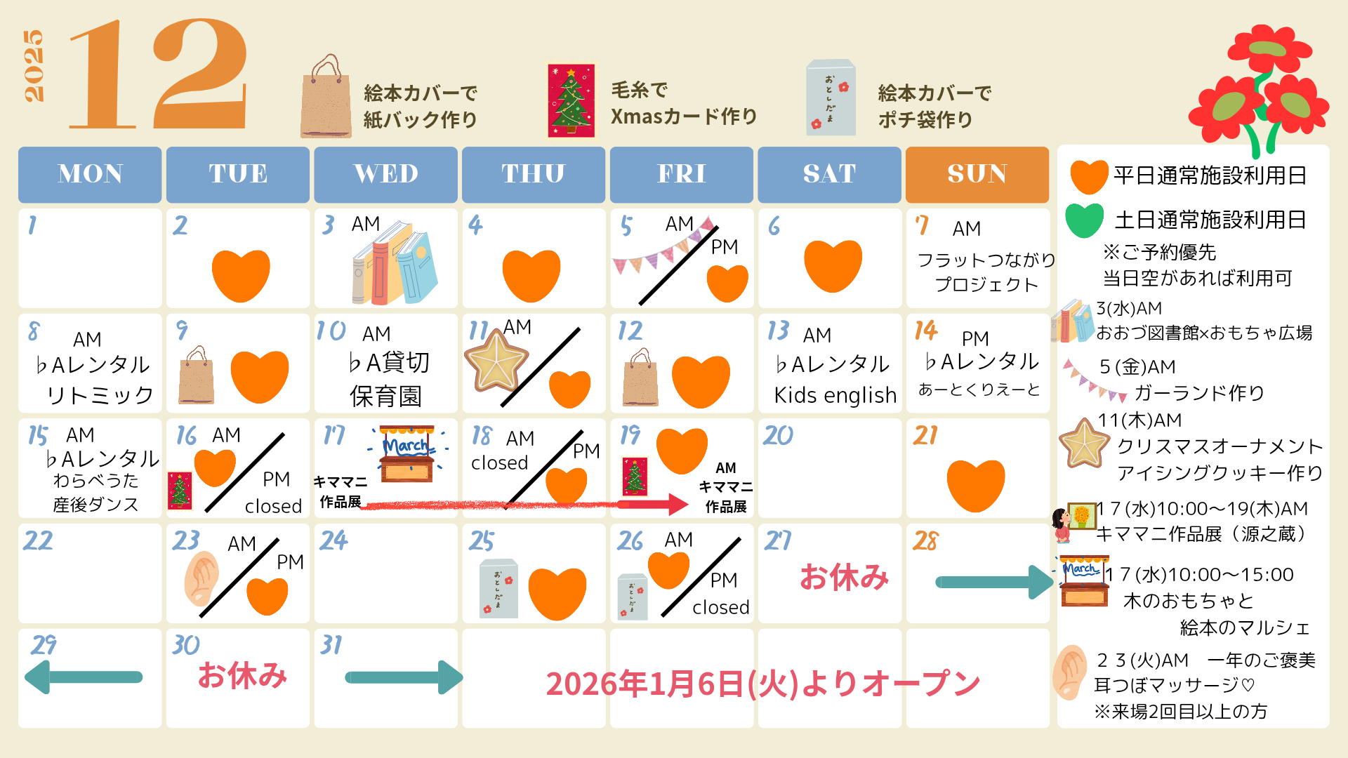1月の平日利用できる日13日間あり(1/6よりOPEN)